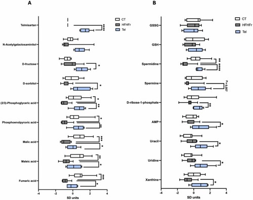 Relevant liver metabolites involved in the antisteatotic effect of telmisartan. Box plots showing the levels of metabolites involved in gluconeogenesis and polyol pathways (A), and those related to pentose phosphate pathway and purine/pyrimidine metabolism (B). Metabolite signal intensities were Z-score normalized for plotting purposes. Statistical analysis was performed with raw data from 6 to 8 animals per group. *P < 0.05. **P < 0.01, ***P < 0.001, ****P < 0.0001. |