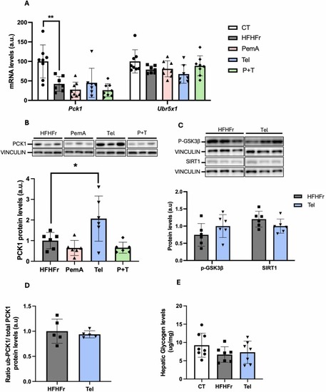 Telmisartan effects on PCK1 expression. (A) Relative liver mRNA levels of Pck1 and Ubr5 from CT, HFHF and Tel groups. (B, C) Relative liver protein levels of PCK1, p-GSK3β and SIRT1 from the corresponding experimental groups. On the upper part of the figures, representative western blot bands are shown. (D) Ubiquitinated PCK1 protein levels relative to total PCK1 protein levels in the livers from CT, HFHFr and Tel groups. (E) Hepatic glycogen content from CT, HFHFr and Tel groups. Quantitative results are presented as bar plots with individual values, showing the mean ± SD of 6–8 animals/group. *P < 0.05, **P < 0.01. |