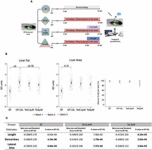 Telmisartan effects on OF+GL model. (A) Schematic representation of the experimental design. (B) Scatter plot of the normalized (Z-score) Liver Lipid Area and Liver Area individual values along with margin plots in the SF, OF+GL and Tel at different concentrations. Scatter plot, mean and standard deviation of the survival rate (%) in experimental tanks from 8 to 10 days post fertilization from CT, OF+GL, Tel 0.4 µM and Tel 2 µM groups. (C) Length, Dorsal Area and Lateral Area of SF, Tel 0.4 µM or Tel 2 µM vs OF+GL group. Analysis was performed using multiple linear regression adjusting the values by “Time of day” and “Batch” (3 Batches). Dorsal and lateral area were additionally adjusted by length. Fold change calculated using raw data is indicated when the differences are statistically significant (P < 0,05) between indicated groups. |