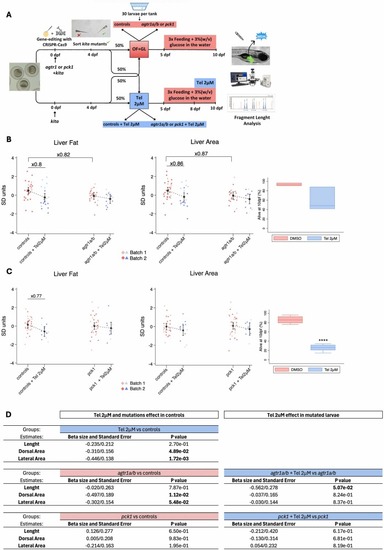 Evaluation of the effects of agtr1 or pck1 mutations, telmisartan treatment or both in OF+GL fed larvae. (A) Schematic representation of the experimental design. Scatter plot of the inversely normalized Liver Lipid Area and Liver Area individual values, along with margin plots for the untreated and treated controls as well as for their respective untreated and treated agtr1a/b (B) or pck1 (C) mutant siblings. Box plots showing the survival rate (%) in Telmisartan 2 µM treated or untreated experimental tanks from 8 to 10 days post fertilization. (D) Effect of mutations and telmisartan treatment or both on Length, Dorsal and Lateral area. Analysis was performed using multiple linear regression adjusting the values by “Time of day” and “Batch” (2 Batches). Fold change calculated using raw data is indicated when the differences are statistically significant (P < 0,05) between groups differing by a single variable. |