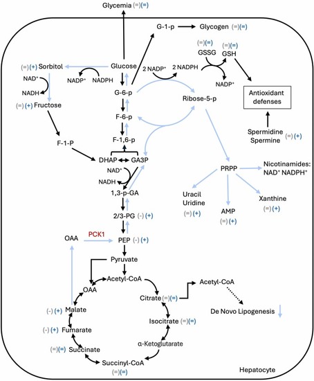 Telmisartan proposed mechanism of action. Blue arrows correspond to the direction of the metabolic flux following telmisartan treatment. Grey and blue sings next to the metabolites indicate the metabolomic analysis results for the HFHFr and Tel groups respectively. 1,3-p-GA: 1,3-phosphoglyceric acid; 2/3-PG: 2/3-phosphoglyceric acid; DHAP: dihydroxyacetone phosphate; F-1-p: fructose 1-phosphate; F-1,6-p: fructose 1,6-diphosphate; F-6-p: fructose 6-phosphate; G-6-p: glucose 6-phosphate; GA3P: glyceraldehyde 3-phosphate; GSH: reduced glutathione; GSSG: oxidized glutathione; OAA: oxalacetate; PCK1: phosphoenolpyruvate carboxykinase 1; PEP: phosphoenolpyruvic acid; PRPP: phosphoribosyl pyrophosphate. |