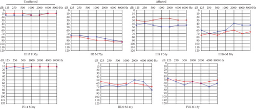 Identification of a novel PRPS1 variant in human hearing loss. (a) Pedigree of a five-generation Chinese family with X-linked HL. Affected males are represented by filled squares, and affected females are represented by circles with center dots. Unaffected individuals are represented by open squares (males) and circles (females). The proband is indicated with a black arrow. Slant lines mark deceased individuals. (b) Audiograms of selected family members, showing air conduction thresholds. Blue “X” denotes the left ear, and red “O” denotes the right ear. (c) Sanger sequencing data from 21 participants showing the normal, hemizygous, and heterozygous PRPS1 variant carriers. (d) Crystal structure of human PRS-I (PDB: 2H06) and the predicted structure with the p.Cys165Tyr variant. (e) Conservation analysis of the cysteine residue at position 165 across species, estimated by T-Coffee. |
