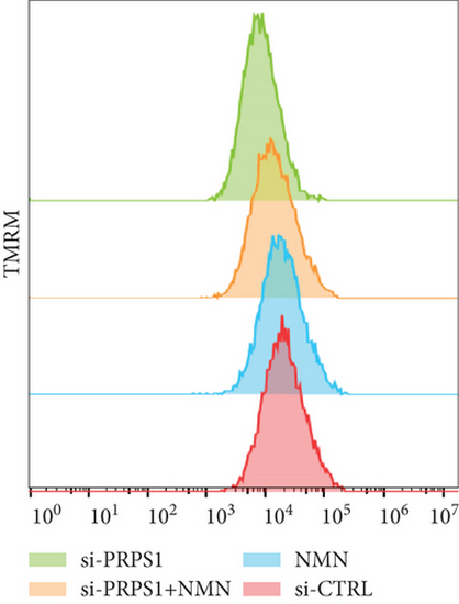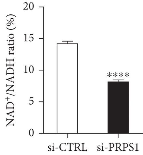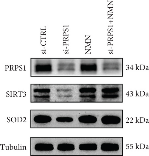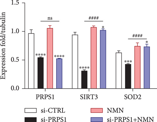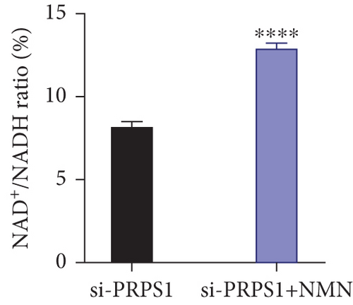 PRPS1 knockdown reduces NAD+ levels, NAD+/NADH ratio, and cell viability in HEI-OC1 cells. (a) Western blot analysis of PRPS1 expression after transfection with PRPS1-siRNA or negative-siRNA, with tubulin as the internal control. (b) Quantification of PRPS1 expression levels from (a). Measurement of intracellular (c) NAD+ levels and (d) NAD+/NADH ratio in si-CTRL and si-PRPS1 groups. Measurement of intracellular (e) NAD+ levels and (f) NAD+/NADH ratio in si-PRPS1 and si-PRPS1+NMN groups. (g) Cell viability assessed by CCK-8 assay. Data are presented as three independent experiments’ mean ± SD. ∗∗∗p < 0.001 and ∗∗∗∗p < 0.0001 compared with the si-CTRL; ####p < 0.0001 compared with the si-PRPS1. |