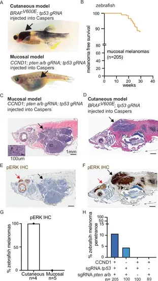Zebrafish model recapitulates localization of human MM. A Light micrographs of zebrafish melanoma generated from melanocyte-specific expression or CRISPR-deletion in transparent “Casper” zebrafish. Cutaneous model (upper). Mucosal model (lower). B MM free survival of zebrafish with melanocyte-specific expression of human CCND1 and melanocyte-specific CRISPR-deletion of pten a and b and tp53. C–G Zebrafish melanoma histology. CM n = 4, MM n = 5. C, D H&E stain of MM (C) and CM (D). E, F Phospho ERK (pERK) immunohistochemistry (IHC) of MM (E) and CM (F). Scale bar = 1 mm; inset scale bar = 100 μm. Black arrow = tumor, red arrow = brain. G Quantification of % pERK positive zebrafish melanomas. H % zebrafish MM penetrance. n = zebrafish. |
