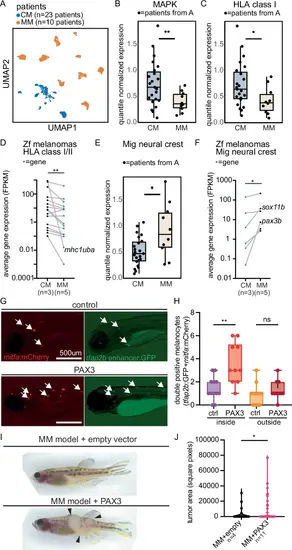 MM cell state is conserved in patients. A UMAP of scRNA-seq from CM patients (n = 23) and MM patients (n = 10). B, C Normalized pseudobulked gene expression in CM vs. MM cells from scRNA-seq for B MAPK target genes, ** = 0.0036, two-sided t-test, and C HLA Class I antigen presentation genes, * = 0.017, two-sided t-test. Dots = patients. D Average gene expression of expressed zebrafish mhc class I/II genes in zebrafish CM vs. MM. Dots = genes. Lines indicate the same gene in both conditions. ** = 0.0017, Wilcoxon matched-pairs rank test. FPKM = fragments per kilobase of transcript per million. E Normalized pseudobulked gene expression in MM vs. CM cells from scRNA-seq for migratory neural crest genes. * = 0.036, two-sided t-test. F Average gene expression (FPKM) of migratory neural crest genes in zebrafish CMs vs. MMs. Dots = genes. Lines indicate the same gene in both conditions. * = 0.031, Wilcoxon matched-pairs rank test. G, H Melanocyte-specific expression of hPAX3 (n = 10) vs. control (n = 12) in Casper zebrafish with labeled internal melanocytes (double positive mitfa-mCherry and tfap2b-GFP) and pigment removal at 6 dpf. G Representative immunofluorescent images. Scale bar = 500 μm. H Quantification of double positive melanocytes inside and outside zebrafish embryos. ** = 0.0014, ns = 0.7813, ordinary one-way ANOVA with multiple comparisons. I, J hPAX3-vs. empty control-expressing zebrafish MM (CCND1; pten a/b gRNA, tp53 gRNA). I Representative images at 23 weeks post-fertilization and J Tumor area quantification (* = 0.048, two-sided t-test). n = tumors. For all box plots, the box is the 25th to 75th percentile range and whiskers show maximum to minimum. For plots (B, C, E) the middle line represents the median. Source data are provided in Source Data Fig. 4. |