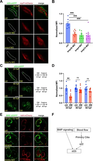 Blood flow and bone morphogenetic protein (BMP) signaling independently activates id2b expression. (A) Representative confocal maximal intensity projection of control (non-injected), bmp2b, bmp4, and bmp7a morpholino-injected id2b:eGFP; Tg(myl7:mCherry) hearts at 24 hr post-fertilization (hpf). White circles outline eGFP signal. (B) Quantification of mean fluorescence intensity of id2b:eGFP in (A). Data normalized to the mean fluorescence intensity of control hearts. n=(7, 9, 8, 10). (C) Representative confocal maximal intensity projection of DMSO and Dorsomorphin (DM)-treated id2b:eGFP hearts at 24, 48, and 60 hpf. Embryos were treated from 10 to 24 hpf, from 24 to 48 hpf, or from 36 to 60 hpf. White circles outline eGFP signal. (D) Quantification of mean fluorescence intensity of id2b:eGFP in (C). Data normalized to the mean fluorescence intensity of DMSO-treated hearts. n=(6, 10) (24 hpf); n=(14, 16) (48 hpf); n=(9, 9) (60 hpf). (E) Confocal optical sections of control, tricaine-treated, and tnnt2a morpholino-injected 72 hpf Tg(BRE:d2GFP); Tg(kdrl:mCherry) hearts. Yellow asterisks, endocardial cells. Yellow arrowheads, BMP signal. Numbers at the top of each panel indicate the ratio of representative images. (F) Schematic diagram of blood flow and BMP signaling-mediated id2b expression. Data are presented as mean ± s.e.m. Unpaired two-tailed Student’s t-tests were used to determine statistical significance.**p<0.01, ***p<0.001. ns, not significant. Scale bars, 50 μm. |
