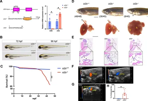 id2b-/- adults exhibit thinner atrioventricular valve leaflets and prominent retrograde blood flow. (A) Two sgRNAs, represented by short vertical lines, were designed to create id2b-/- mutants. Co-injection of the two sgRNAs with zCas9 protein induces a 157 bp truncation in the exon 1 of id2b, which can be detected by genotyping primers marked with arrows. This genetic modification leads to the formation of a premature stop codon and the subsequent loss of the helix-loop-helix (HLH) domain. Right, quantitative real-time PCR (qRT-PCR) analysis of id2b and id2a mRNA levels in id2b+/+ and id2b-/- adult hearts. (B) No discernible morphological differences were observed between id2b+/+ and id2b-/- larvae at both 72 hr post-fertilization (hpf) and 96 hpf. (C) Kaplan-Meier survival curve analysis and log-rank test of id2b+/+ (n=50) and id2b-/- (n=46). Wpf, weeks post-fertilization. (D) Pericardial edema and an enlarged atrium are evident in a subset of id2b-/- adults. V, ventricle; A, atrium. (E) id2b-/- adults developed thinner atrioventricular valve leaflets (denoted by arrowheads) compared to id2b+/+. Enlarged views of boxed areas are shown in the bottom panels. (F, G) Echocardiograms of adult id2b+/+ (F) and id2b-/- (G) hearts. Unidirectional blood flow was observed in the id2b+/+ heart, while retrograde blood flow was evident in the id2b-/- heart. (H) Ratio of retrograde flow area over inflow area shows a significant increase in retrograde flow in id2b-/- (n=13) compared to id2b+/+ (n=10). Data are presented as mean ± s.e.m. Unpaired two-tailed Student’s t-tests were used to determine statistical significance. *p<0.05, **p<0.01, ***p<0.001. Scale bars, 500 μm (B and D, bottom), 2 mm (D, top), 200 μm (E). |