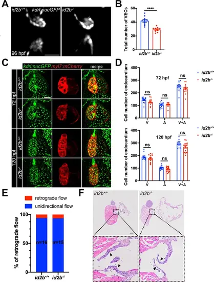 id2b-/- larvae exhibit a decreased number of valve endocardial cells while maintaining normal atrioventricular valve function. (A) Representative confocal images of valve endocardial cells in 96 hr post-fertilization (hpf) id2b+/+ and id2b-/- hearts carrying Tg(kdrl:nucGFP). (B) Quantification of the number of valve endocardial cells in id2b+/+ and id2b-/- hearts. VECs, valve endocardial cells. n=(10, 10). (C) Representative confocal images of 72 and 120 hpf id2b+/+ and id2b-/- hearts in Tg(kdrl:nucGFP); Tg(myl7:mCherry) transgenic background. (D) Statistical analysis of the number of endocardial cells in the ventricle (V), atrium (A), and combined (A+V) in id2b+/+ and id2b-/- hearts. n=(13, 13) (72 hpf); n=(12, 15) (120 hpf). (E) Quantification of blood flow patterns in 96 hpf id2b+/+ (n=16) and id2b-/- (n=15) hearts. (F) Hematoxylin and eosin (HE) staining of adult id2b-/- and id2b+/+ hearts after echocardiographic analysis in Figure 4F and G. Enlarged views of boxed areas are shown in the bottom panels. Data are presented as mean ± s.e.m. p-values were calculated by unpaired two-tailed Student’s t-tests. ****p<0.0001. ns, not significant. Scale bars, 20 μm (A), 50 μm (C), 200 μm (F). |