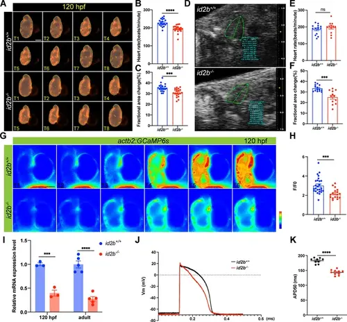 Reduced cardiac contractile function and compromised calcium handling in id2b-/- mutants. (A) Time-lapse imaging (from T1 to T8) illustrates the cardiac contraction-relaxation cycle of 120 hr post-fertilization (hpf) id2b+/+ and id2b-/- hearts carrying myl7:mCherry. (B and C) id2b-/- larvae (n=20) display a significant decrease in heart rate and fractional area change compared to id2b+/+ (n=20). (D) Echocardiograms of adult id2b+/+ and id2b-/- hearts. (E and F) id2b-/- fish (n=12) exhibit reduced cardiac contractile function with preserved heart rate compared to id2b+/+ (n=14). (G) Time-lapse imaging illustrates the calcium dynamics of 120 hpf id2b+/+ and id2b-/- hearts carrying actb2:GCaMP6s. (H) Ratio of maximal fluorescence intensity (F) over basal fluorescence intensity (F0) of GCaMP6s signal. n=(26, 17). (I) Quantitative real-time PCR (qRT-PCR) analysis of cacnα1c mRNA in id2b+/+ and id2b-/- hearts at 120 hpf (N=3 biological replicates, with each sample containing 500–1000 embryonic hearts) and adult stage (N=5 biological replicates). Data were normalized to the expression of actb1. (J) The action potential of ventricular cardiomyocytes in adult id2b+/+ (n=9) and id2b-/- (n=9) hearts. (K) Statistical data showed a notable difference between id2b+/+ and id2b-/- accordingly. Data are presented as mean ± s.e.m. p-values were calculated by unpaired two-tailed Student’s t-tests. ***p<0.001, ****p<0.0001, ns, not significant. Scale bars, 50 μm. |