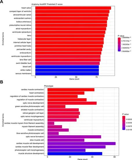 id2b loss-of-function impacts both valve formation and cardiac contraction. (A) The top 20 predicted tissue expression patterns based on the differentially expressed genes from id2b+/+ and id2b-/- hearts at 120 hr post-fertilization (hpf) were displayed. (B) The top 20 predicted phenotypes related to the differentially expressed genes from id2b+/+ and id2b-/- hearts at 120 hpf were illustrated. |