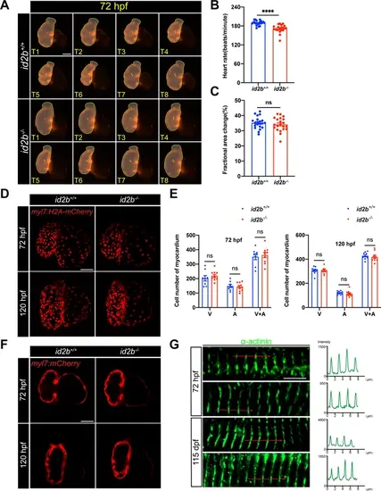 id2b-/- hearts develop normal trabeculae and sarcomeres. (A) Time-lapse imaging (from T1 to T8) illustrates the cardiac contraction-relaxation cycle of 72 hr post-fertilization (hpf) id2b+/+ and id2b-/- hearts carrying myl7:mCherry. (B and C) Heart rate and fractional area change in id2b-/- (n=21) and id2b+/+ (n=21) at 72 hpf. (D) Representative confocal z-stack of 72 and 120 hpf id2b+/+ and id2b-/- hearts with Tg(myl7:H2A-mCherry) transgene. (E) Quantification of the number of cardiomyocytes in the ventricle (V), atrium (A), and combined (A+V) in (D). n=(8, 10) (72 hpf); n=(10, 10) (120 hpf). (F) Representative confocal images of 72 and 120 hpf id2b+/+ and id2b-/- hearts carrying Tg(myl7:mCherry). (G) Confocal immunofluorescence images of α-actinin (green) in embryonic (72 hpf) and adult (115 dpf) hearts (left). Right: fluorescence intensity profiles for α-actinin. Data are presented as mean ± s.e.m. p-values were calculated by unpaired two-tailed Student’s t-tests. ****p<0.0001. ns, not significant. Scale bars, 50 μm (D and F), 5 μm (G). |