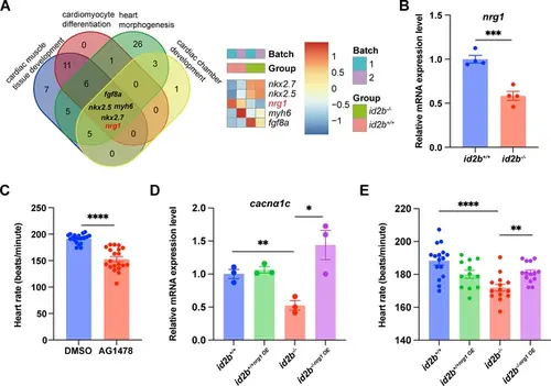 Nrg1 serves as a pivotal mitogen mediating the function of id2b. (A) Identification of genes (fgf8a, nkx2.5, myh6, nrg1, and nkx2.7) associated with four distinct heart development processes: cardiac muscle tissue development, cardiomyocyte differentiation, heart morphogenesis, and cardiac chamber development. The heatmap illustrates scaled-normalized expression values for the mentioned genes. (B) Quantitative real-time PCR (qRT-PCR) analysis of nrg1 mRNA in 120 hr post-fertilization (hpf) id2b+/+ and id2b-/- embryonic hearts. Data were normalized to the expression of actb1. N=4 biological replicates, with each sample containing 500–1000 embryonic hearts. (C) Heart rate in 120 hpf larvae treated with AG1478 (n=20) and DMSO (n=20). (D) id2b+/+ and id2b-/- larvae were injected with nrg1 mRNA at the one-cell stage, followed by qRT-PCR analysis of cacnα1c mRNA at 72 hpf. Data were normalized to the expression of actb1. N=3 biological replicates, with each sample containing 100–200 embryonic hearts. (E) The heart rate of 72 hpf id2b+/+ and id2b-/- larvae injected with nrg1 mRNA at one-cell stage. n=(16, 12, 14, 14). Data are presented as mean ± s.e.m. p-values were calculated by unpaired two-tailed Student’s t-tests. *p<0.05, **p<0.01, ***p<0.001, ****p<0.0001. |