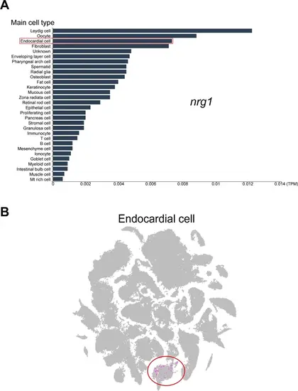 nrg1 is expressed in the endocardial cells. (A) Analysis of nrg1 expression using the zebrafish single-cell landscape database. The red rectangle highlights endocardial cells. (B) Identification of the endocardial cell population in the zebrafish cell landscape. Purple dots represent endocardial cells, and the red oval denotes cell populations from the heart. Images were generated using the Zebrafish Cell Landscape (ZCL) at http://bis.zju.edu.cn/ZCL/. |