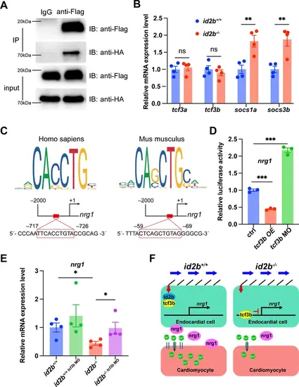 Id2b interacts with Tcf3b to restrict its inhibition on nrg1 expression. (A) Immunoprecipitation (IP) assays of Flag-id2b and HA-tcf3b co-transfected 293T cells. (B) Quantitative real-time PCR (qRT-PCR) analysis of tcf3a, tcf3b, socs1a, and socs3b mRNA in 120 hr post-fertilization (hpf) id2b+/+ and id2b-/- embryonic hearts. Data were normalized to the expression of actb1. N=4 biological replicates, with each sample containing 500–1000 embryonic hearts. (C) Two potential Tcf3b-binding sites, with sequences corresponding to the human TCF3 (left) and mouse Tcf3 (right) binding motifs, were predicted in the 2000 bp DNA sequence upstream of the zebrafish nrg1 transcription start site using JASPAR. (D) Luciferase assay showing the expression of nrg1 in embryos with tcf3b overexpression (tcf3b OE) and morpholino-mediated tcf3b knockdown (tcf3b MO). N=3 biological replicates. (E) qRT-PCR analysis of nrg1 mRNA in 72 hpf id2b+/+ and id2b-/- embryonic hearts injected with control and tcf3b morpholino. Data were normalized to the expression of actb1. N=4 biological replicates, with each sample containing 100–200 embryonic hearts. (F) Schematic model for id2b-mediated regulation of myocardium function. During heart development, blood flow operates through primary cilia, initiating endocardial id2b expression. Subsequently, the interaction between Id2b and Tcf3b restricts the activity of Tcf3b, ensuring proper nrg1 expression, which in turn promotes L-type calcium channel (LTCC) expression (left). However, in the absence of Id2b, Tcf3b inhibits nrg1 expression. The reduced Nrg1 hinders LTCC expression in cardiomyocytes, resulting in decreased extracellular calcium entry and disruption of myocardial function. Data are presented as mean ± s.e.m. p-values were calculated by unpaired two-tailed Student’s t-tests. *p<0.05, **p<0.01, ***p<0.001. ns, not significant. |