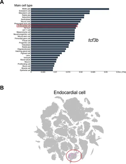 Expression landscape of zebrafish tcf3b. (A) The major cell types expressing tcf3b were displayed according to the zebrafish single-cell landscape. (B) Identification of the endocardial cell population in the zebrafish cell landscape. Purple dots represent endocardial cells, and the red oval denotes cell populations from the heart. Images were generated using the Zebrafish Cell Landscape (ZCL) at http://bis.zju.edu.cn/ZCL/. |
