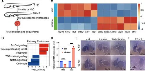 Identification of id2b as a blood flow-sensitive gene. (A) Schematic showing the experimental procedures, including treatment, heart collection, and RNA-sequencing of zebrafish embryonic hearts. (B) KEGG enrichment analysis depicting differentially expressed genes encoding transcription factors and transcriptional regulators between control (ctrl) and tricaine-treated embryonic hearts. Red and blue rectangles represent upregulated and downregulated gene sets, respectively. |log2fold change|≥0.585, adjusted p-value<0.1. Each replicate contains approximately 1000 hearts. (C) Heatmap exhibiting representative genes from KEGG pathways mentioned in (B). (D) Quantitative real-time PCR (qRT-PCR) analysis of id2b and id2a mRNA in control and tricaine-treated embryonic hearts. Data were normalized to the expression of actb1. Each sample contains ~1000 embryonic hearts. N=3 biological replicates. (E) In situ hybridization of id2b in 72 hr post-fertilization (hpf) and 96 hpf ctrl, tricaine (1 mg/mL), and blebbistatin (10 μM)-treated embryos. Numbers at the bottom of each panel indicate the ratio of representative staining. (F) In situ hybridization showing reduced id2b expression in tnnt2a morpholino-injected embryos at 72 hpf compared to control. Data are presented as mean ± s.e.m. Unpaired two-tailed Student’s t-tests were used to determine statistical significance. ***p<0.001. Scale bars, 50 μm. |