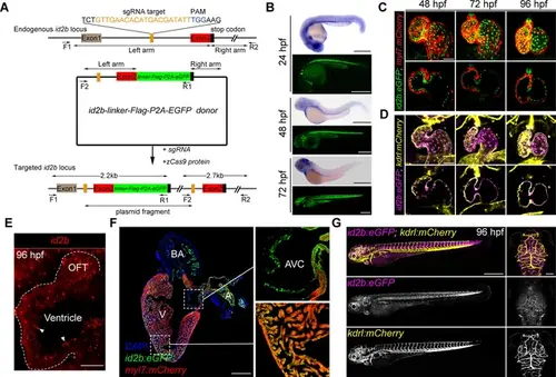 The spatiotemporal expression of id2b. (A) Schematic of the intron targeting-mediated eGFP knock-in at the id2b locus using the CRISPR-Cas9 system. The sgRNA targeting sequence and the protospacer adjacent motif (PAM) sequence are shown in orange and blue, respectively. The donor plasmid comprises left and right arm sequences and a linker-FLAG-P2A-eGFP cassette denoted by black lines with double arrows and green box, respectively. The linker-FLAG-P2A-eGFP cassette was integrated into the id2b locus upon co-injection of the donor plasmid with sgRNA and zCas9 protein, enabling detection by PCR using two pairs of primers (F1, R1 and F2, R2) - the former length yielding a length of about 2.2 kb and the latter about 2.7 kb. (B) Zebrafish id2b expression pattern, as indicated by in situ hybridization of embryos at designated time points, was consistent with the fluorescence localization of id2b:eGFP, revealing expression in the heart, brain, retina, notochord, pronephric duct, and other tissues. (C) Maximum intensity projections (top) and confocal sections (bottom) of id2b:eGFP; Tg(myl7:mCherry) hearts at designated time points. (D) Maximum intensity projections (top) and confocal sections (bottom) of id2b:eGFP; Tg(kdrl:mCherry) embryos at specific time points. Magenta, id2b:eGFP; yellow, kdrl:mCherry. (E) RNAscope analysis of id2b in 96 hr post-fertilization (hpf) embryonic heart. White dashed line outlines the heart. OFT, outflow tract. (F) Immunofluorescence of adult id2b:eGFP; Tg(myl7:mCherry) heart section (left panel). Enlarged views of boxed areas are shown in the right panel. Green, eGFP; red, mCherry; blue, DAPI. BA, bulbus arteriosus; V, ventricle; A, atrium; AVC, atrioventricular canal. (G) Confocal z-stack maximum intensity projection of id2b:eGFP;Tg(kdrl:mCherry) embryos at 96 hpf showing the whole body (lateral view) and the head (top view). Scale bars, 500 μm (B, F, left, and G), 50 μm (C and D), 25 μm (E), 100 μm (G, right). |