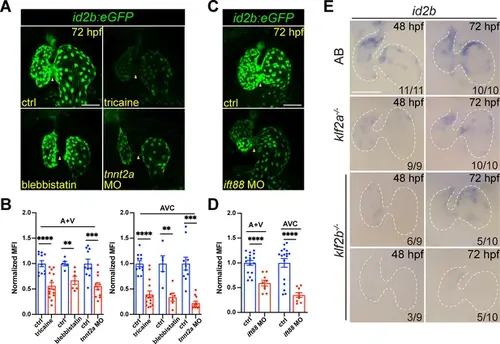 Cardiac contraction promotes endocardial id2b expression through primary cilia. (A) Representative confocal z-stack (maximal intensity projection) of id2b:eGFP embryos under different conditions: control, tricaine-treated, blebbistatin-treated, and tnnt2a morpholino-injected. Images were captured using the same magnification. (B) Quantification of mean fluorescence intensity (MFI) of id2b:eGFP in the working myocardium (atrium and ventricle, A+V) and atrioventricular canal (AVC) in (A). Data normalized to the MFI of control hearts. n=(11, 15) (ctrl versus tricaine); n=(5, 6) (ctrl versus blebbistatin); n=(10,11) (ctrl versus tnnt2a MO). (C) Representative confocal z-stack (maximal intensity projection) of control and ift88 morpholino-injected id2b:eGFP embryos. (D) Normalized MFI of id2b:eGFP in the working myocardium (A+V) and AVC in (C). n=(17, 9). (E) Whole-mount in situ hybridization showing id2b expression in control, klf2a-/-, and klf2b-/- embryos at 48 hr post-fertilization (hpf) and 72 hpf. Numbers at the bottom of each panel indicate the ratio of representative staining. Data are presented as mean ± s.e.m. Unpaired two-tailed Student’s t-tests were used to determine statistical significance. **p<0.01, ***p<0.001, ****p<0.0001. Scale bars, 50 μm. |