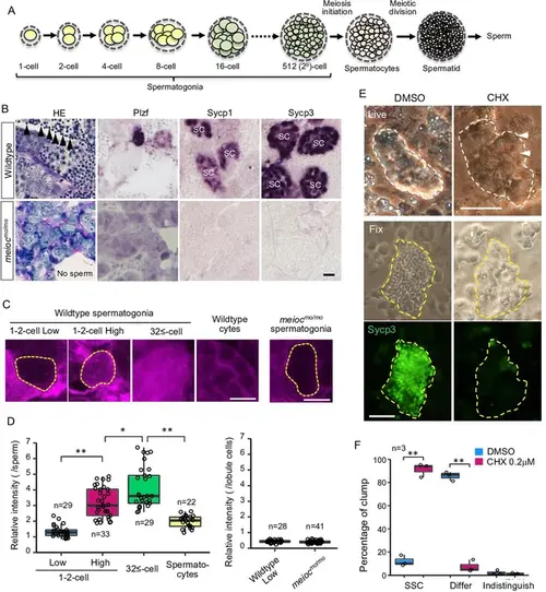 Low translational activity of meioc mutant spermatogonia. (A) Schema of the development of spermatogonial cysts surrounded by Sertoli cells and progression of spermatogenesis in zebrafish. (B) Histology (HE) and immunostaining against Plzf and spermatocyte markers (Sycp1, 3) in the wild-type and the moto-/- testes. Arrowheads: sperm. SC: spermatocytes. Scale bar: 10 µm. (C, D) OP-Puro fluorescence analysis (C) and quantification of the signal intensities (D) in wild-type and meiocmo/mo spermatogenic cells. Dotted lines: 1- to 2-cell spermatogonia. Scale bars: 10 µm. (E–F) Effect of cycloheximide (CHX, 0.2 µM) on differentiation of spermatogonial stem cells (SSCs) in culture. Dotted lines: germ cell clumps. Sycp3: immunostaining of Sycp3. Arrowheads: examples of a cell with a large nucleolus. Scale bar: 50 µm. The graph (F) presents the percentage of clumps of SSCs and differentiated cells (Differ) shown in E. Indistinguish: not determined whether dominant cell type was stem or differentiated. Data are represented as mean ± SD. *p<0.05, **p<0.01. |