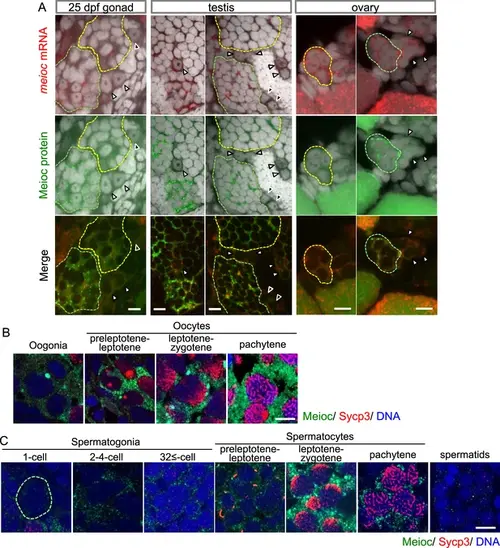 Expression patterns of Meioc in wild-type germ cells. (A) Expression patterns of meioc mRNA and Meioc protein in gonads at 25 days post-fertilization (dpf) and adult testes and ovaries. Black arrowheads indicate cells that express neither mRNA nor protein, and white arrowheads indicate cells that have the mRNA signals and weak protein signals. Yellow dotted lines indicate cysts containing cells positive for both mRNA and diffuse protein signals, including small or weak granules, and green dotted lines indicate cysts containing cells with mRNA signals and bright protein signals, including large granules. Scale bar: 10 µm. (B) Double staining of ovary at 25 dpf with anti-Meioc antibody (green) and anti-Sycp3 antibody (red). Staging of oocytes was defined by the patterns of Sycp3. Scale bar: 5 µm. (C) Double staining of wild-type testes with anti-Meioc antibody (green) and anti-Sycp3 antibody (red). Staging of spermatogonia was defined by the number of cells in the cyst, and staging of spermatocytes was defined by the patterns of Sycp3. Scale bar: 5 µm. |