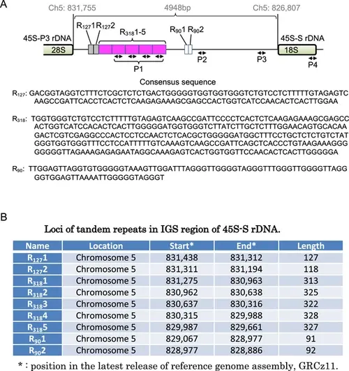Schema of the intergenic spacer (IGS) (chromosome 5: 826807–831755 reverse strand) and the 127, 318, and 90 bp tandem repeat sequences (A) and loci of the tandem repeats (B). Two-way arrows indicate the position of primers used in ChIP-qPCR analysis (Figure 6F and G). |