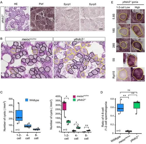 ythdc2 mutant spermatogonia have different defects from meiocmo/mo. (A) Histology (HE) and immunostaining against Plzf and spermatocyte markers (Sycp1, 3) in the ythdc2-/- testes. (B) Representative image of meiocmo/mo and ythdc2-/- testes sections stained with PAS (periodic acid Schiff) and hematoxylin. Dotted lines: 1- to 2-cell cyst spermatogonia (black) and 4≤-cell cysts (yellow). (C) The number of 1- to 2-, 4-, and 8-cell cyst spermatogonia per mm2 of sections in wild-type, meiocmo/mo, and ythdc2-/- testes. (D) Ratio of the number of 4- to 8-cell cyst spermatogonia to 1- to 2-cell cysts in wild-type, meiocmo/mo, and ythdc2-/- testes. (E) In situ hybridization of 5S, 5.8S, 18S, and 28S rRNA and immunohistochemistry with anti-Rpl15 antibody in the ythdc2-/- testes. Yellow dotted lines: 1- to 2-cell spermatogonia. *p<0.05, **p<0.01, ns: not significant. Scale bars: 10 µm. |