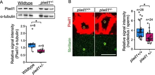 Reduction of Piwil1 in piwil1+/-. (A) Western blot analysis of Piwil1 and α-Tubulin (upper panels) and quantification of Piwil1 (lower panel) in piwil1+/+ and piwil1+/- testes. (B) Immunostaining against Piwil1 and fibrillarin (left panels) and quantification of nucleolar Piwil1 signal intensities (right panel) in piwil1+/+ and piwil1+/- spermatogonia (1- to 2-cell cysts). Yellow dotted lines: nucleoli. For each graph, data were analyzed by Student’s t-test: *p<0.05. |