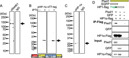 Interaction of Piwil1 with Setdb1 and HP1α. (A) Western blot analysis of wild-type testis extracts using anti-mouse Setdb1 antibody. Arrow: Setdb1. (B) Western blot analysis of zebrafish HP1α expressed from bacterial expression vectors using anti-human HP1α antibody and anti-T7-tag antibody. Isopropyl-β-D-thiogalactopyranoside (IPTG) was added for culture of host cells (BL21) to induce expression of HP1α with T7-tag. Schema: construction of expression vector (pet21a). Arrow: HP1α fusion protein. (C) Western blot analysis of wild-type testis extracts using anti-human HP1α antibody. Arrow: HP1α. (D) Pull-down assay using Flag-tagged HP1α and Piwil1 or EGFP. Schema: conditions of coexpression of each protein in HEK-293A cells used for the pull-down assay. |