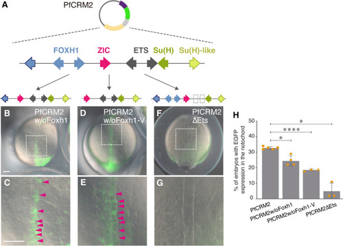 Foxh1 and Ets sites of the hemichordate SFZE syntax are functionally important for notochord activity. ( |
