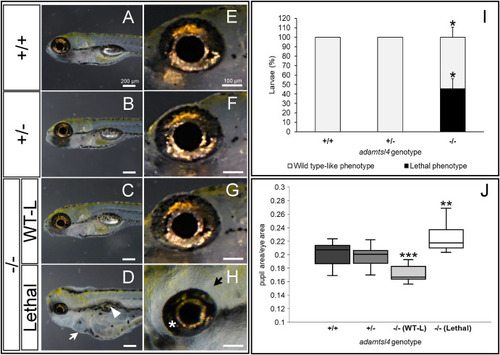 Morphological characterization of F3 adamtsl4-KO larvae at 6 dpf. Representative photographs of wild type (+/+), heterozygous (±), wild type-like knockout (−/− (WT-L)), and lethal knockout (−/− (Lethal)) larvae are shown. A-D. General body morphology. White arrow: pericardial edema; White arrowhead: abnormal swim bladder. E-H. Magnification of ocular structures. I. Quantification of the percentage of KO larvae displaying wild type-like and lethal phenotypes. The data represent three independent replicates with the following total sample sizes: wild type, n = 31; heterozygous, n = 59; mutant homozygous, n = 23. J. Quantification of pupil area normalized to total eye area. The following sample sizes were used for eyes: wild type, n = 24; heterozygous, n = 24; homozygous, n = 24. ∗: p < 0.05; ∗∗: p < 0.01; ∗∗∗: p < 0.001. PHENOTYPE: