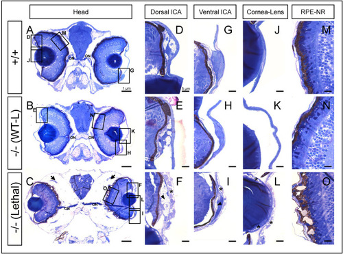 Histological analysis of toluidine blue-stained tissue sections from adamtsl4 KO zebrafish larvae (6 dpf). Transverse semithin tissue sections (500 nm) were prepared as described in the Materials and Methods section. Representative photographs of wild type (+/+), wild type-like KO (−/− (WT-L)) and lethal KO (−/− (Lethal)) larvae are shown. A-C. Tissue sections from the central part of the eyeball (note the presence of the optic nerve (ON)); rectangles indicate areas magnified in subsequent panels. D-F. Dorsal iridocorneal angle (ICA). G-I. Ventral ICA. J-L. Cornea and lens. M-O. Retinal pigmented epithelium (RPE)-neuroretina (NR) interphase. Asterisks: abnormal intercellular separations; black arrows: periocular edema; black arrowhead: increased xantophores; white arrows: amorphous deposits in the RPE. (For interpretation of the references to colour in this figure legend, the reader is referred to the Web version of this article.) PHENOTYPE: