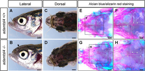 Craniofacial characterization of 5 months F3 adamtsl4-KO zebrafish. A-D. Representative images of wild-type and adamtsl4-KO zebrafish before clearing and staining, highlighting gross craniofacial morphology. E-H. Staining with alcian blue for cartilage and alizarin red for bone structures reveals detailed craniofacial anatomy. Rectangles indicate regions of interest magnified in subsequent panels, providing a closer examination of structural differences between genotypes. White arrows indicate intracranial sutures. (For interpretation of the references to colour in this figure legend, the reader is referred to the Web version of this article.) PHENOTYPE: