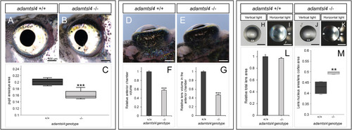 Morphological phenotype characterization of 5 months F3 adamtsl4-KO zebrafish. A-B. Lateral morphology of the eye. (C) Quantification of pupil area relative to the eye area. Sample size: wild-type, n = 5; adamtsl4-KO, n = 9. D-E. Dorsal morphology of the eyes. F. Quantification of anterior chamber volume. G. Quantification of the visible lens volume within the anterior chamber. Sample size in F–G: wild-type, n = 20; adamtsl4-KO, n = 72. H-K. Lens morphology and light transmission. L. Quantification of total lens area. M. Quantification of lens nucleus area relative to the cortex area. Sample sizes: wild-type, n = 4; adamtsl4-KO, n = . ∗∗: p < 0.01; ∗∗∗: p < 0.001. Black asterisk: increased xanthophores. Black arrow: irregular pupil morphology. White asterisk: impaired light transmission in the lens. White arrow: direction of light. Cx, cortex; nu, nucleus. PHENOTYPE: