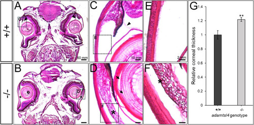 Histological analysis of hematoxylin-eosin-stained tissue sections from adult adamtsl4 KO zebrafish (5 months). Transverse tissue sections were prepared as described in the Materials and Methods section. Representative photographs of wild type (+/+) and KO (−/−) zebrafish are shown. A-B. Tissue sections from the central part of the eyeball highlighting the presence of the optic nerve (ON). C-D. Anterior segment. E-F. Corneal structure. G. Quantitative analysis of corneal thickness. ∗∗: p < 0.01. Rectangles indicate areas magnified in subsequent panels. Arrows: separation of lens fibers; Asterisks: abnormal annular ligament. PHENOTYPE: