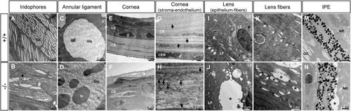 Transmission electron microscopy of the ocular anterior segment structures in adult (3-months-old) F3 adamtsl4 KO zebrafish. Tissue sections were prepared as described in the Materials and Methods section. Representative images of wild type (+/+) and KO (−/−) zebrafish are shown. A-B. Guanine crystals (GC) in iridophores. C-D. Glycoprotein aggregates (Gly) and cytoplasmic inclusions (In) in annular ligament cells. E-F. Cornea showing the thickened corneal epithelium (CE) and the necrotic superficial epithelial cell (white asterisk) in the KO zebrafish. G-H. Corneal stroma (CS) and endothelium (CEN). Note the contact between the CEN with the abnormal annular ligament in the KO zebrafish (black arrowhead). I-J. Lens epithelium (LE)-fiber (LF) interphase. K-L. Lens fibers. Gap junctions (white arrows). M-N. Iris pigment epithelium (IPE)-neuroretina (NE) interphase. Black asterisks: abnormal intercellular separations. |