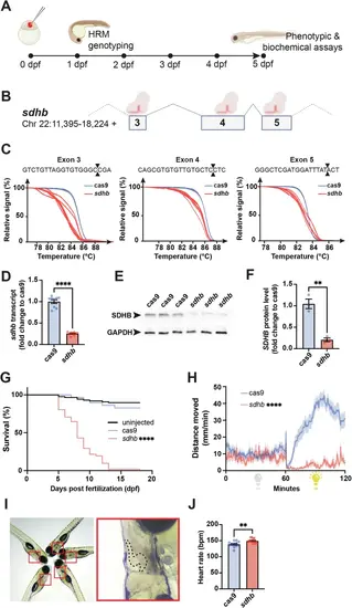 F0-injected sdhb-CRISPant zebrafish larvae display SDHB-associated phenotypes. A Timeline representation of our CRISPant approach starting with the microinjection of a gene-specific (i.e., sdhb) CRISPR/Cas9 mix in single-cell embryos, followed by High-Resolution Melting (HRM) genotyping from 1-day post-fertilization (dpf). Phenotypic and biochemical readouts can be acquired only few days following injection. B The genetic landscape of the zebrafish sdhb gene encompassing targeted exons 3, 4 and 5. C The mutagenic power of the injected CRISPR/Cas9 mix is validated by HRM comparing Cas9-injected embryos as controls in which only mRNA encoding CAS9 was microinjected (no gene-specific guide RNAs). D, E, F The level of sdhb expression is reduced in sdhb CRISPants both at the transcriptomic and protein levels as assessed by qRT-PCR (D) and western blot (E, F). (G) Survival of sdhb CRISPants (n = 51) is compared to Cas9-injected controls (n = 29) and uninjected larvae (n = 87) over 18 days. H The distance swam, binned per 30 s, is recorded for sdhb CRISPants (n = 32) and Cas9-injected controls (n = 32) during 60 min dark and 60 min light periods. I, J Representative setup and results of heart rate quantification in 5 dpf larvae (sdhb CRISPants, n = 13; Cas9-injected, n = 12). I Left: larvae mounted laterally in 3% methylcellulose for simultaneous video acquisition (~5 larvae per trial). Red boxes indicate individual larvae analyzed. Right: magnified view of one larva with the heart region outlined (dashed line), corresponding to the area used for automatic beat detection by DanioScope™ software. No anesthetic was used during acquisition. J Heart rate was quantified and compared using an unpaired t-test with two-tailed p-value calculation: ** p-value < 0.01; **** p-value < 0.0001. Icons in (A) and (B) are created in BioRender. Samarut, E. (2025) |