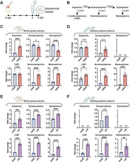 Catecholamine and metanephrine levels are affected in PPGL CRISPant zebrafish models. A Individual embryos are microinjected at the one-cell stage and larvae are pooled at 4 dpf overnight. Catecholamines and metanephrines levels were assessed on day 5 from whole larvae lysates and bathing medium. B Metabolic path of catecholamines and metanephrine synthesis. Enzymes are italicized (DBH: Dopamine beta-hydroxylase, PNMT: Phenylethanolamine N-Methyltransferase, COMT: Catechol-O-methyltransferase). C,D Catecholamines and metanephrines levels in sdhb CRISPants (n ≥ 6 pools of 10 larvae) compared to Cas9-injected controls (n ≥ 6 pools of 10 larvae) (whole larvae, (C) and bathing medium (D)). E,F Catecholamines and metanephrines levels in nf1 CRISPants (whole larvae, (E) and bathing medium (F). Of note, the levels of NE were below the detection limit in Cas9-control samples, and a subjective basal value was used to calculate the NE fold-change increase in nf1-CRISPant larvae. Unpaired t-test with two-tailed p-value calculation: * p-value < 0.05; ** p-value < 0.01; *** p-value < 0.001; **** p-value < 0.0001. Icons are created in BioRender. Samarut, E. (2025) https://BioRender.com/xk8wiuf. |