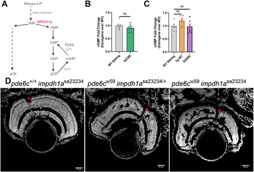 Altering Impdh1a does not affect cGMP levels. (A) Schematic of de novo purine biosynthesis of cGMP, with IMPDH1a highlighted in red. In the light, phosphodiesterase 6 (PDE6) converts cGMP into GMP. (B) Steady-state levels of cGMP from K238E mutant zebrafish or WT siblings. Zebrafish with class 1 mutant, K238E, do not have raised steady-state levels of cGMP. n=6 for both groups. ns, not significant (P=0.36) (unpaired two-tailed t-test). Error bars are s.e.m. (C) Steady-state levels of cGMP from Tg WT, D226N mutant or WT zebrafish. Zebrafish with class 1 mutant, D226N, do not have raised steady-state levels of cGMP. n=6 for all groups. ns, not significant (P=0.079 for Tg WT and P=0.85 for D226N) (unpaired two-tailed t-test). Error bars are s.e.m. (D) Larval optic nerve slices with nuclei stained with Hoechst. Scale bars: 25 µm. An Impdh1a KO zebrafish shows no signs of degeneration, whereas the Pde6c mutant has signs of severe degeneration at 5 dpf. The Pde6c mutant, Impdh1a KO zebrafish also shows signs of severe degeneration by 5 dpf. Knocking out Impdh1 did not rescue or delay degeneration of the model with high cGMP. Red arrowheads point to the cone layer. |