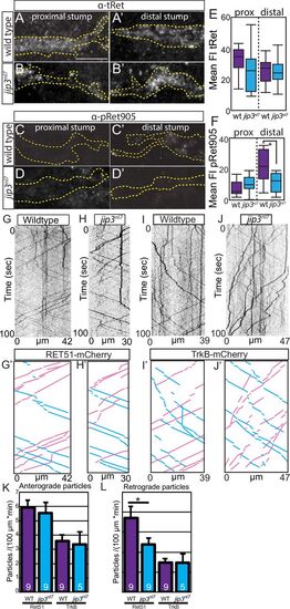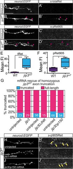 In Figure 5, panel 5C was inadvertently duplicated in place of panel 5D. These images contain two channels: GFP, which outlines the nerve stump, and pRet905 immunolabeling. The GFP channel (not shown in Figure 5) was used to generate the dotted nerve outline for pRet905 quantification. While the pRet905 image in panel 5D was incorrect due to duplication, the GFP channel and thus the nerve outline was correct. |