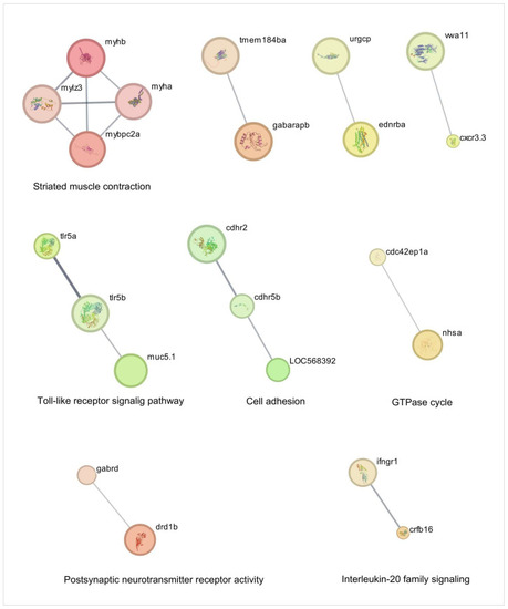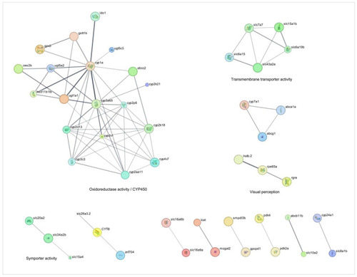 Network analysis of drug-metabolizing enzymes-related genes overexpressed during injury-induced inflammation in zebrafish larvae treated with TnP compared to untreated control. Protein-protein interaction (PPI) networks of 74 differentially overexpressed genes ( |