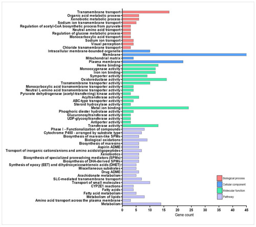 Enrichment analysis of drug-metabolizing enzymes-related genes overexpressed during injury-induced inflammation in zebrafish larvae treated with TnP compared to untreated control. Functional enrichment analysis focusing on the overexpressed genes list (71 DAVID IDs) related to drug-metabolizing enzymes using the DAVID software. Terms were considered significant if the adjusted |