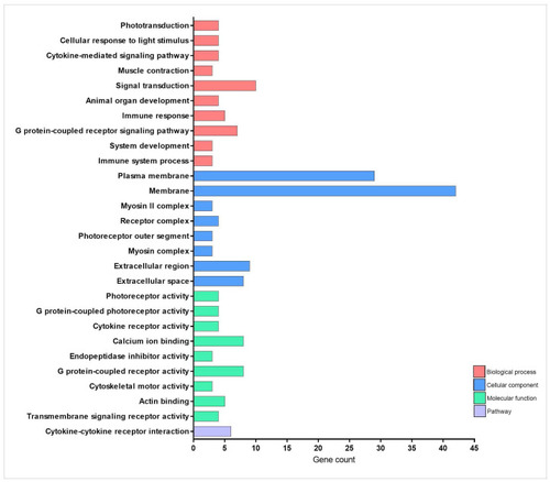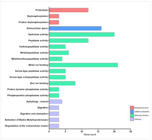 Enrichment analysis of cell activity-related genes overexpressed during injury-induced inflammation in zebrafish larvae treated with TnP compared to untreated control. Functional enrichment analysis focusing on the overexpressed genes list (52 DAVID IDs) related to cell activity using the DAVID software. Terms were considered significant if the adjusted |
