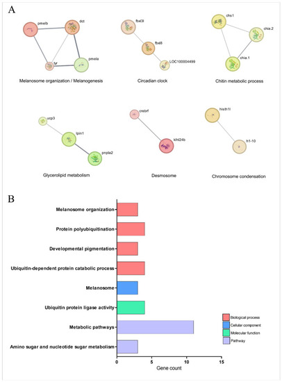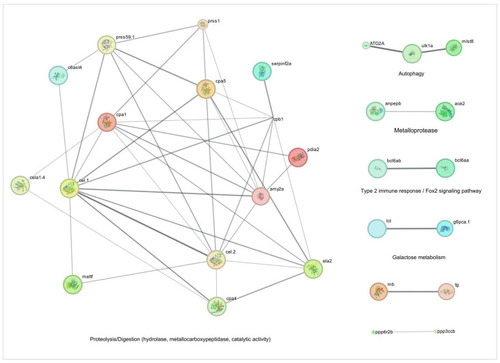Network and enrichment analysis of cell activity-related genes overexpressed during injury-induced inflammation in zebrafish larvae treated with TnP compared to untreated control. Protein-protein interaction (PPI) networks of 57 differentially overexpressed genes ( |