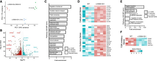 Transcriptomic analysis of variant-containing human iPSCs reveals alterations in neurodevelopmental pathways and endolysosomal function (A) Principal-component analysis (PCA) plot of RNA-seq data generated using DESeq2. Data were derived from induced pluripotent stem cell (iPSC) lines representing three groups (n = 4 biological replicates per group): wild type (WT), TMEM184Bc.550A>G/+, and TMEM184Bc.550A>G/c.550A>G. (B) Volcano plot illustrating the differential expression analysis results for TMEM184Bc.550A>G/+. Genes meeting the significance threshold (p < 0.05) and fold-change criteria (log2FC > 0.585 for upregulated genes [= FC > 1.5], log2FC < −0.415 for downregulated genes [= FC < 0.75]) are highlighted in teal (upregulated) and red (downregulated), respectively. (C) Downregulated GO biological processes (slim) (>1.5× enriched) in TMEM184Bc.550A>G/+. (D) Genes in two processes of likely relevance (regulation of cell pH and axon guidance) are plotted in respective Z-score normalized heatmaps. (E) Upregulated GO biological processes (slim) (>1.5× enriched) in TMEM184Bc.550A>G/+. (F) Heatmap of genes within one process of likely relevance (negative regulation of TOR signaling), scaled identically to (D). het, heterozygous; homo, homozygous; (+), WT allele. |