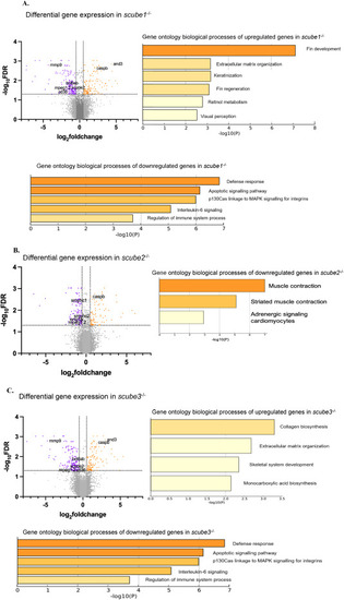 RNA seq analysis of scube1−/−, scube2−/−and scube3−/−embryos at 30 hpf. (A) RNA sequencing of scube1 mutants revealed upregulation of processes related to fin development and regeneration, extracellular matrix formation, keratinisation, and eye development. Conversely, there is a downregulation of processes associated with the immune response system (response to bacterium, interleukin-6 signalling, response to wounding, platelet degranulation Herpes infection), apoptotic signalling and response to estrogen. (B) RNA sequencing of scube2−/− zebrafish mutants indicated downregulation of processes linked to muscle contraction and adrenergic signalling in cardiomyocytes. (C) RNA sequencing of scube3−/− zebrafish mutants revealed upregulation of processes related to collagen synthesis, extracellular matrix formation, and skeletal system development. Conversely, downregulated processes include those involved in the defence response system, specifically interleukin-6 signalling and the regulation of immune system processes. Yellow bars indicate lower significance or enrichment, while orange bars indicate higher values. FDR cutoff = 0.05. Volcano plots displaying differential gene expression between scube mutants and wild-type zebrafish. The x-axis shows log2 fold change in gene expression, and the y-axis indicates - log10 FDR. Each point represents an individual gene. Genes with absolute log2 fold change greater than 0.5 and FDR less than 0.05 are highlighted: upregulated genes are orange, downregulated genes are purple, and non-significant genes are grey. |