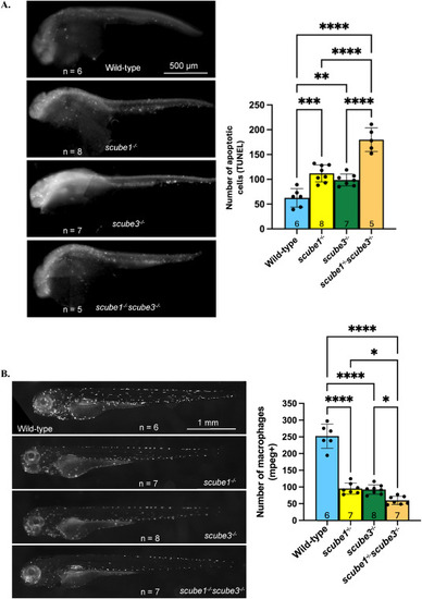 Increased apoptosis and reduced macrophage numbers in scube mutants. (A) The TUNEL assay revealed a greater number of apoptotic cells in scube1−/−, scube3−/−, and scube1−/−scube3−/− compared with wild-type at 30 hpf. Double mutants for scube1 and scube3 showed significantly higher numbers of apoptotic cells than either single mutant. ANOVA F(3,24) = 107.9, p < 0.0001. (B) Macrophage numbers decrease in scube mutants. Tg(mpeg1:Gal4-FF)gl25/Tg(UAS-E1b:nfsB.mCherry)c264 reporter line was used to label macrophages. Live imaging of zebrafish at 3 dpf showed fewer macrophages in scube1−/−, scube3−/−, and the double mutant scube1−/−scube3−/− compared to controls. The double mutant displayed a further reduction in macrophage numbers compared to either single mutant. ANOVA, F (3, 22) = 41.26, p < 0.0001. |