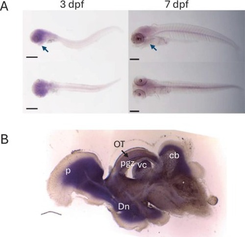 Distribution of hcn2b mRNA. A. hcn2b was detected in the whole brain retina and heart (arrow) at 3 dpf, this distribution is maintained at 7 dpf. B. Adult distribution of hcn2b mRNA includes the pallium (p), the optic tectum (OT), the periventricular gray zone of optic tectum (pgz), the valvula cerebelli (vc), the cerebellum (Cb) and the diffuse nucleus of the inferior lobe (Dn). EXPRESSION / LABELING: