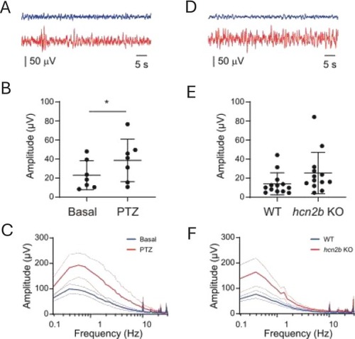 Electrophysiological activity from extracellular recordings. A and D. Representative traces showing electrical activity components from 0.5 to 8 Hz, control or basal activity is shown in blue and PTZ and hcn2b mutants activity is shown in red. B. Average amplitude taken from 2 to 4 Hz spectra indicates the mean, standard deviation and individual subjects, shows a significant increase in PTZ (*p < 0.05, Wilcoxon's t-test, n = 7). C. Summary amplitude distribution along the frequency spectra in basal (blue) and PTZ (red), thin lines show the S.E.M. E. Average amplitude taken from 2 to 4 Hz spectra indicates the mean, standard deviation and individual subjects show a trend to increase in the amplitude without a significant change on hcn2b KO compared to the control group. F. Summary amplitude distribution along the frequency spectra in control group (blue) and hcn2b KO (red), thin lines show the S.E.M. PHENOTYPE: