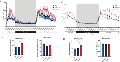 hcn2b KO is more active during the light hours of the day. A. 24 h locomotor activity of larvae (7 dpf). B. Statistically significant differences were observed in the locomotor activity of hcn2b mutants during the light-cycle but not in the dark-cycle. Data expressed as the means ± SEM and analyzed by Kruskal–Wallis n = 27, p < 0.05 (*). C. Average swimming speed during a 24 h cycle. D. Consistent with differences in traveling distance, in average hcn2b KO swam faster during the light cycle. Data expressed as the means ± SEM and analyzed by Kruskal–Wallis n = 27, p < 0.05 (*), p < 0.01 (**). PHENOTYPE: