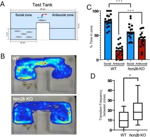 Altered social activity in hcn2b KO. A. Scheme of the experimental test tank. A U-shape test tank was designed to evaluate the social interaction in WT and hcn2b KO. In the social zone the U-arm included five fish from the same tank as the evaluated fish while the antisocial zone arm was empty. B. Sample 10 min tracking of a single fish (WT or hcn2b KO) in the test tank. C. Percentage of time spent by tested fish in social (blue) and antisocial (red) zones during a 10-minute assay. D. Transition frequency between zones. The number of times the fish crossed the center of the tank between social and antisocial zones. WT n = 18, hcn2b KO = 17. Unpaired t test in B (P value > 0.001) and in C (P value 0.012). PHENOTYPE: